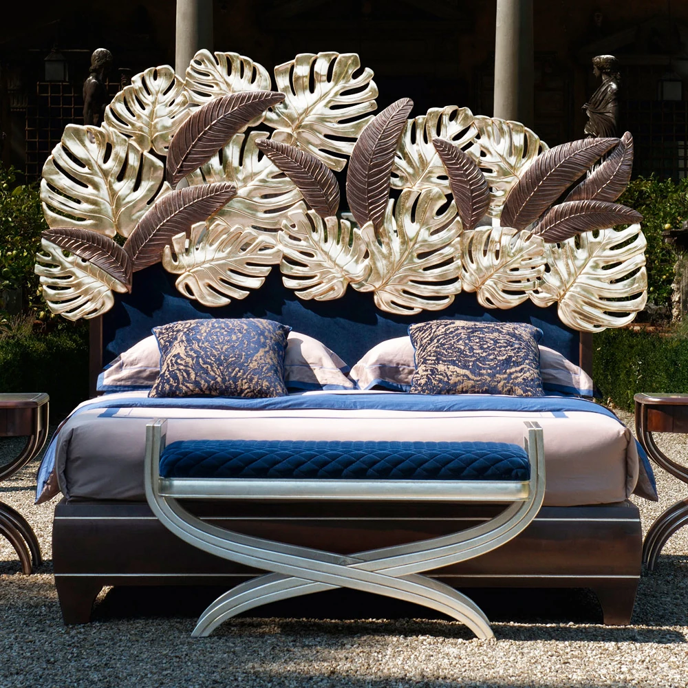 Embrace the elegance of nature with this Luxurious Bed, featuring a beautifully crafted palm leaf design headboard. Inspired by tropical serenity and refined artistry, the sculpted headboard adds texture, movement, and a sense of escape to your bedroom. Hand-finished with care and made from premium materials, this bed combines comfort with bold design, making it a true statement piece. The sturdy frame ensures lasting support, while the graceful lines and organic motif bring a calming, resort-like feel to your space. Perfect for high-end interiors, this bed transforms your bedroom into a sophisticated tropical retreat.