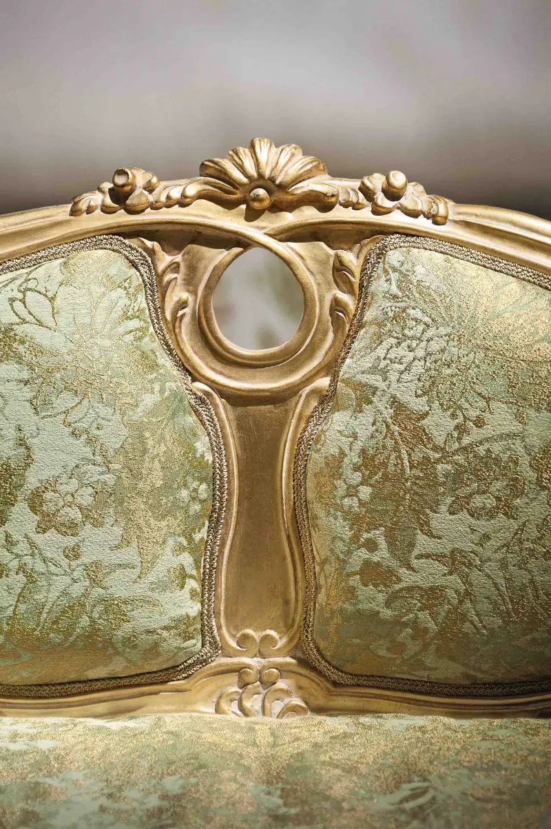 Made of solid teak, the frame is carved by experienced artisans with decorated curves and details that will brighten up vintage luxury. The sofa is finished in a hand-crafted rustic gold colour, creating an ancient aura and maintaining the robustness of premium wooden craftsmanship. This design includes exhausted shaped armrests, curved legs, high rounded gore and finesse.
